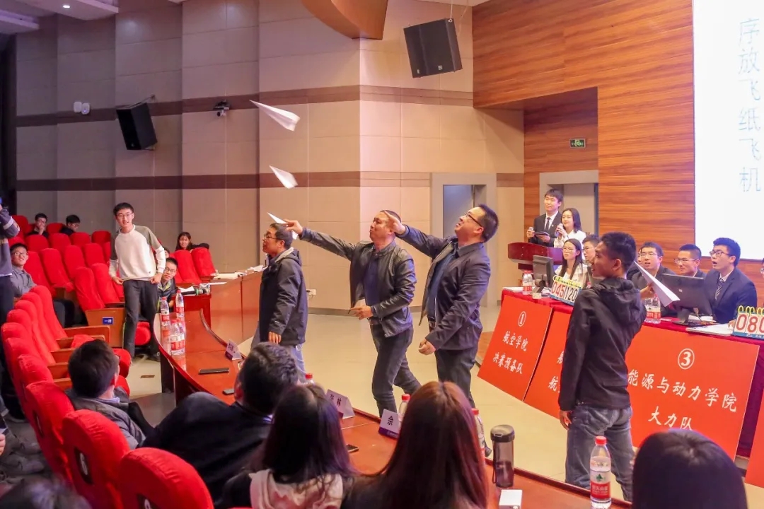 “心灵手巧”环节,选手们需现场制作完成并放飞纸飞机,每队有两次机会。3号、5号和6号代表队的飞机直接飞到了会场的最后一排,引得全场阵阵欢呼。谈及他们的设计理念时,5号队运用了减少展弦比的原理,而3号能源与动力学院代表队则更注重于放飞的动力大小。“心有灵犀”环节,团队成员相互配合猜出航空航天专有名词,6号个人代表队表现抢眼,猜出全部五张图片。“背水一战”最后一个环节,共五道题,分值从10分到50分依次递增,答对得相应分数,答错扣除相应分数,高风险,高回报。比分落后的队伍放手一搏,比分领先的队伍也没有束手束脚,最后的胜负就在毫厘之间。