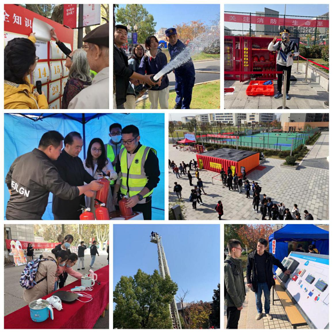 11月9日当天的现场活动是消防安全宣传月的重头戏,保卫处在三校区组织开展了生动有趣的大型现场互动体验活动。校党委副书记陶勇同志到场观摩指导,现场气氛热烈,一千多名师生员工积极参与。消防安全知识问答、消防器材展示、试穿战斗服、消防设备故障排除、违章电器识别、消防模拟逃生屋、沉浸式模拟灭火、消防升降云梯体验等活动寓教于乐,师生们纷纷表示,活动内容新颖多样,知识性、趣味性与实践性紧密结合,大家在轻松愉快的体验中感悟着消防安全的真谛。