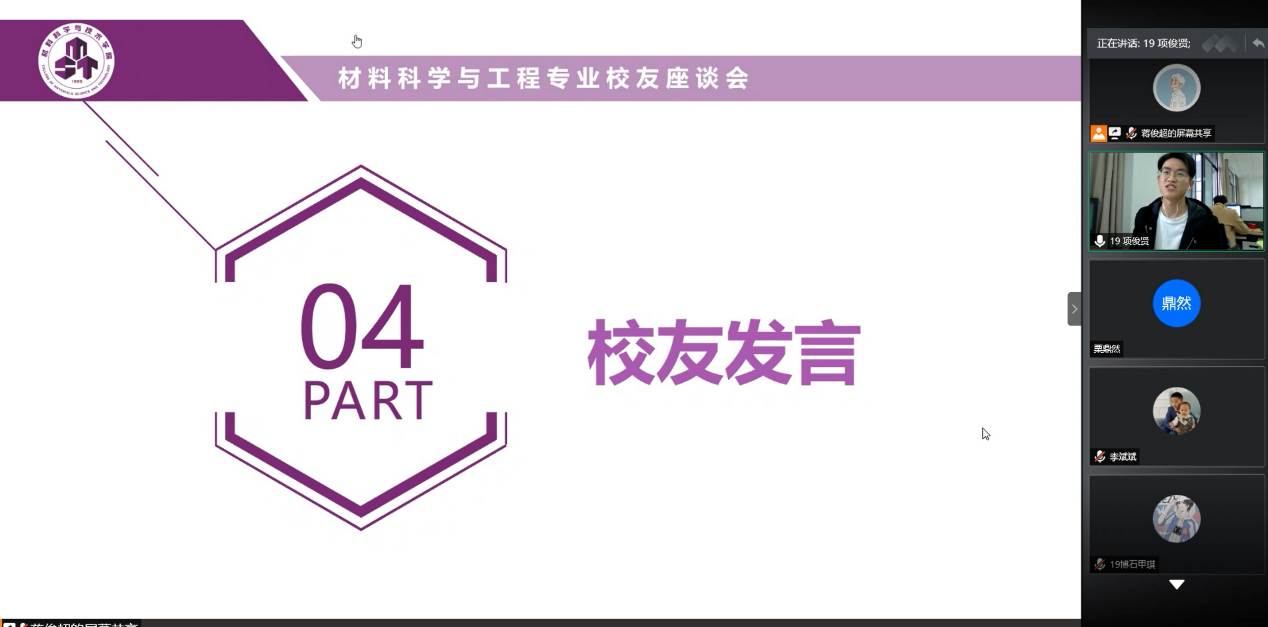 为听取校友及用人单位对专业培养的意见和建议,进一步提升教育质量,材料科学与技术学院于11月21日上午在腾讯会议举办材料科学与工程专业校友座谈会,学院党委书记孙占久,院长张校刚,副院长陶海军,院党委副书记许赞,材料科学与工程专业负责人陶杰等13位教师代表参与了本次会议,2017-2020届共17位毕业生校友代表列席参加。