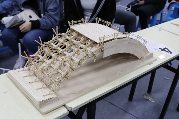 而不限材料的模型展示组中,同学们精心制作的作品也带来了惊喜,各种力学与美的结合巧妙得让人赞叹。使用木棍搭接成的桁架木拱桥与由柱式与扁平式木条搭建,这两个作品分别夺得了两个校区展示组特等奖。