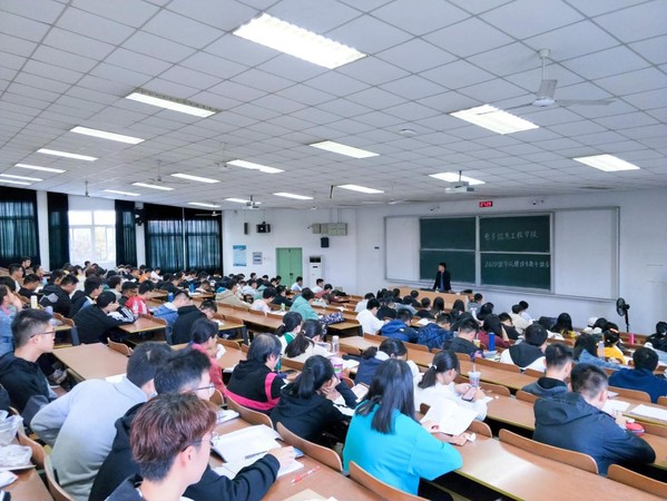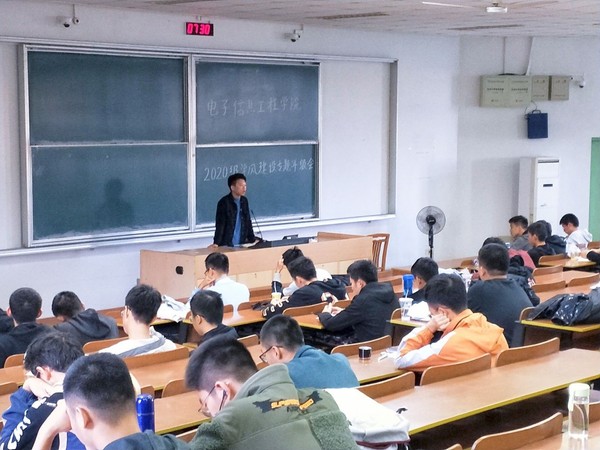 11月18日早,电子信息工程学院2020级辅导员梅旭鹏为大一新生开展以“建设优良学风,争做电子先锋”为主题的学风建设专题年级大会。