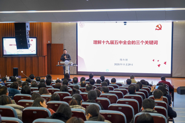 活动中,我校马克思主义学院副院长陈红桂教授向与会领导和老师做题为“理解十九届五中全会的三个关键词”的主题报告。