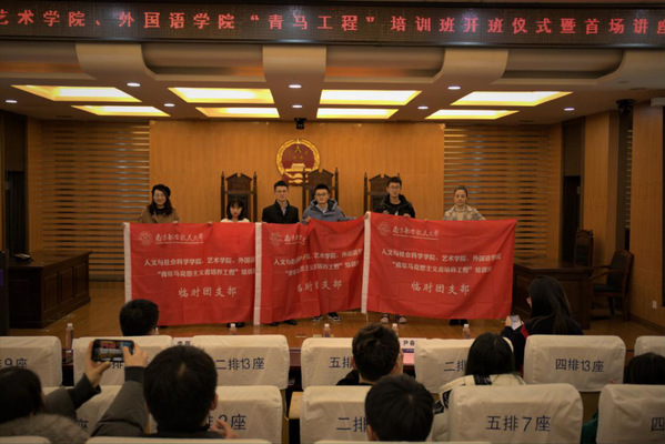 2020年11月26日晚19时,2020-2021年度人文学院、艺术学院、外国语学院青马工程开班仪式暨首场报告在人文与社会科学学院模拟法庭成功举行。