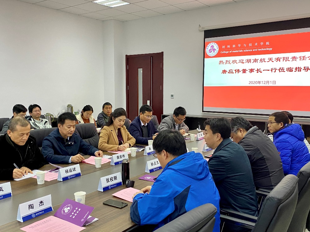 为积极响应学校校企合作战略,加强我校与航天科工集团合作交流,12月2日,材料科学与技术学院与湖南航天有限责任公司开展对接,围绕双方科研项目合作、人才联合培养、毕业生需求等进行座谈。会议由学院党委书记孙占久主持,湖南航天董事长唐应伟及公司骨干成员、材料学院领导班子成员及相关专业教师参会。