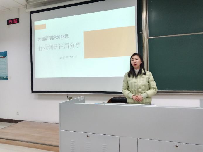 为让外国语学院2018级本科生充分了解如何开展留学、就业、考研行业调研,明确行业调研的工作内容和实施方法,12月1日晚,在D1113教室开展了行业调研往届经验分享主题年级会。分享人2017级本科生蒋逸伦、杨雨柔、赵刘颖以及2018级全体同学参加了此次年级会,会议由辅导员盛嘉贤主持。