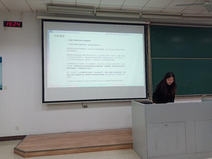 接着,杨雨柔同学就考研方向的行业调研进行了分享,以南京航空航天大学大学英语专业为例,具体讲解了行业调研时要注意考研形势、参考书目的选读、考研准备时间、复习备考策略等事项。
