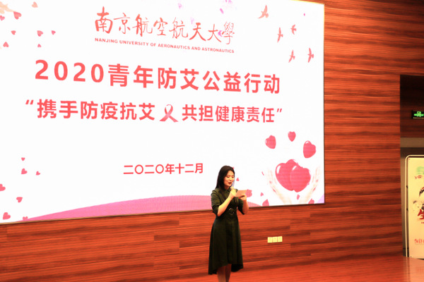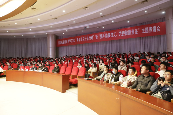 12月2日晚,南京航空航天大学2020“青年防艾公益行动”暨“携手防疫抗艾,共担健康责任”主题宣讲会在一号楼4楼报告厅举行。本次活动由中国青年报社、中国性病艾滋病防治协会主办,南京航空航天大学团委承办,机电学院团委协办,吉利德科学提供公益支持。中国青年报社新闻事业部刘亚廷,南京市江宁疾控中心疾控一科副科长金鑫,校团委副书记董羽,机电学院团委书记侯新闻,机电学院学工办主任孙志海,以及来自各个学院的300余名同学参加活动。
