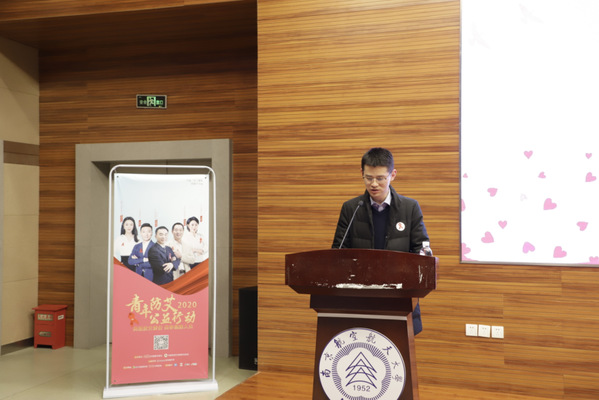 首先,校团委董羽书记上台致辞。董羽指出,广泛宣传艾滋病的预防知识,不仅帮助人们消除恐慌,增强自我保护意识,还能带动社会其他成员消除歧视,关爱艾滋病患者。希望通过2020青年防艾公益行动,能够进一步增强青年人的防艾意识,责任担当意识和个人健康意识,让更多新时代青年真正从中受益,为遏制和防治艾滋病、推进健康中国行动,做出我们应有的贡献。