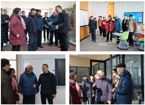 蒋彦龙代表长空学院对七位教授的莅临表示热烈欢迎,衷心感谢教授们对“续火烛心·寻迹长空”活动的大力支持,并陪同七位教授参观了长空学院“准书院制”智慧教育空间。自“润&致”文化广场起,蒋彦龙详细介绍了“润”、“致”两字的文化内涵,并以此引出长空学院的育人理念,介绍了各类典型举人举措。沿“润&致”文化走廊,蒋彦龙陪同七位教授依次参观了智慧教室、学生自主服务中心、导师研讨室、学生活动吧等学生自主修读、师生交流的区域与场所。参观中,蒋彦龙表示,长空学院正在以“润&致”文化打造高水平师生交流平台,希望长空学子可以在师生交流中收获温暖、感受珍贵、汲取智慧、获得力量、学会感恩,并能立足现在、回望过去,挖掘南航发展史的精神内核,传递老一辈南航奋斗者的精神力量。七位教授对长空学院的育人环境和育人理念给予了高度认可。