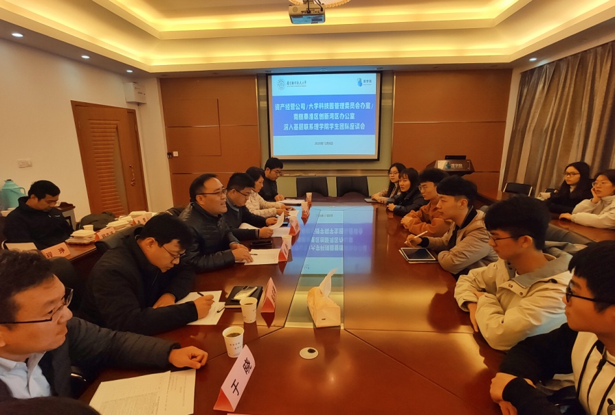 12月8日,资产经营有限公司/大学科技园管理委员会办公室/秦淮创新湾区办公室赴理学院开展联系基层学生活动,与学生创业团队展开座谈交流,调研学生创新创业的开展情况,征求学生对学校创新创业工作的意见和建议,制定一对一精准指导方案。资产经营公司总经理、大学科技园管理委员会办公室主任阎雷、大学科技园管理委员会办公室副主任许爱华、资产经营公司副总经理戴芊、资产经营公司副总经理吴庆春、理学院学生工作领导、理学院学生创业团队代表参加了座谈。