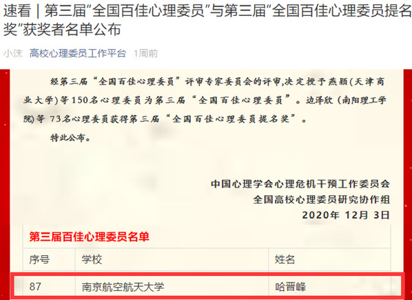 2020年是全国高校心理委员工作研讨会暨朋辈心理辅导论坛举办的第十五年。11月23日上午,第十五届全国高校心理委员工作研讨会暨朋辈心理辅导论坛以线上直播的形式正式拉开帷幕。经过全校综合选拔,我校推荐了材料科学与技术学院的哈晋峰、电子信息工程学院的罗岚、民航/飞行学院的张晨阳、同学参与全国百佳心理委员的评选。最终,哈晋峰从全国248名参赛者中脱颖而出,荣获“第三届全国百佳心理委员”称号,罗岚,张晨阳同学荣获“第三届全国百佳心理委员提名奖”。
