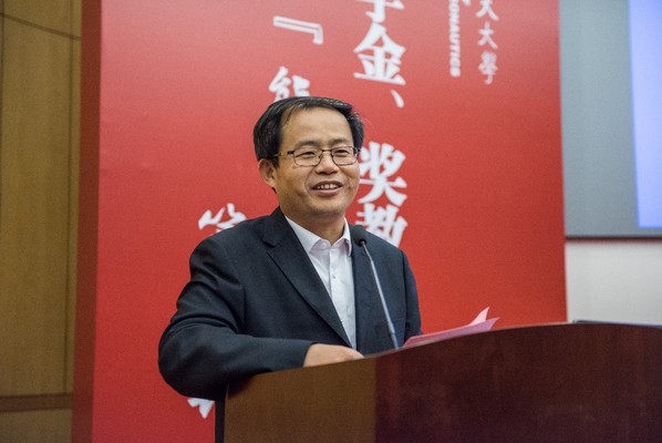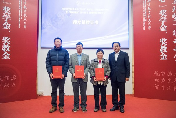 单忠德为校友代表甘晓华、林麒、胡晓峰颁发“航心”专项奖励基金捐赠证书。