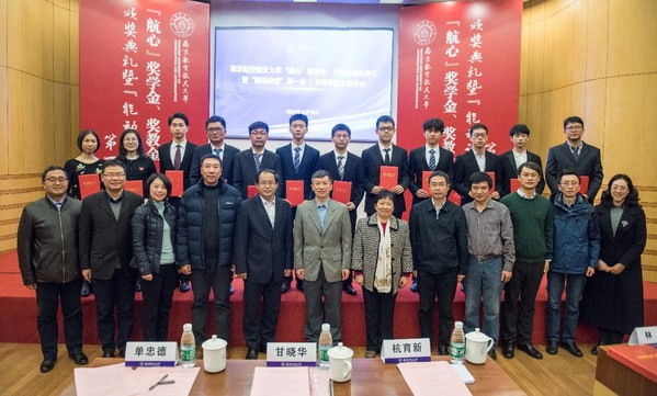 胡晓峰宣读《关于表彰2019-2020学年“航心”奖学金、奖教金的决定》。于兵等3位老师获得“航心”奖教金,汪勇等9位同学获得“航心”奖学金。甘晓华、单忠德、杭育新等为获奖师生颁奖并合影留念。