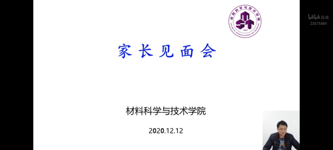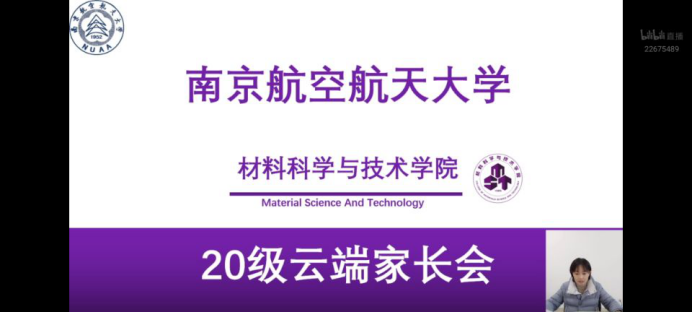 秋风起兮白云飞,草木黄落雁南归。对于20级的新生来说,2020年是一个特别的年份,他们通过了疫情的考验,从千军万马中脱颖而出踏进了南航的大门,他们也是最独立的一届,报道、体检、整理寝室,每个人都独立地走出了大学的第一步。由于疫情的影响,开学初的家长见面会没能如期举办,所以材料科学与技术学院在2020年12月12日通过互联网开展了云端家长会,参会嘉宾有材料科学与技术学院院长张校刚、本科教学副院长陶海军、党委副书记许赞,本科20级辅导员于航,值得一提的是,学院特别邀请到了心理健康中心的倪亚红老师来为家长做一场特别的讲座。本次家长会由学院党委副书记许赞主持召开。