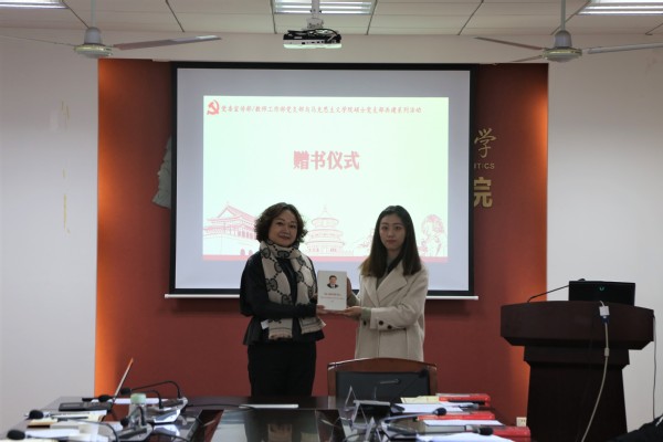 王晖总结讲话,她围绕“为什么要聘任学生宣讲员”“怎样做好学生宣讲员”和“学生宣讲员应该做什么”以及文明校园创建工作等方面展开,希望同学们履行好“习近平新时代中国特色社会主义思想学生宣讲员”的职责,增强业务水平,不断提升宣讲水平,让宣讲内容更加深入人心;履行好“校园文明监督员”职责,实现文明校园共建共创共享。此次交流会上,宣传部/教师工作党支部的老师们还为学生党支部的每位党员赠送了《习近平谈治国理政》第三卷(英文版)。
