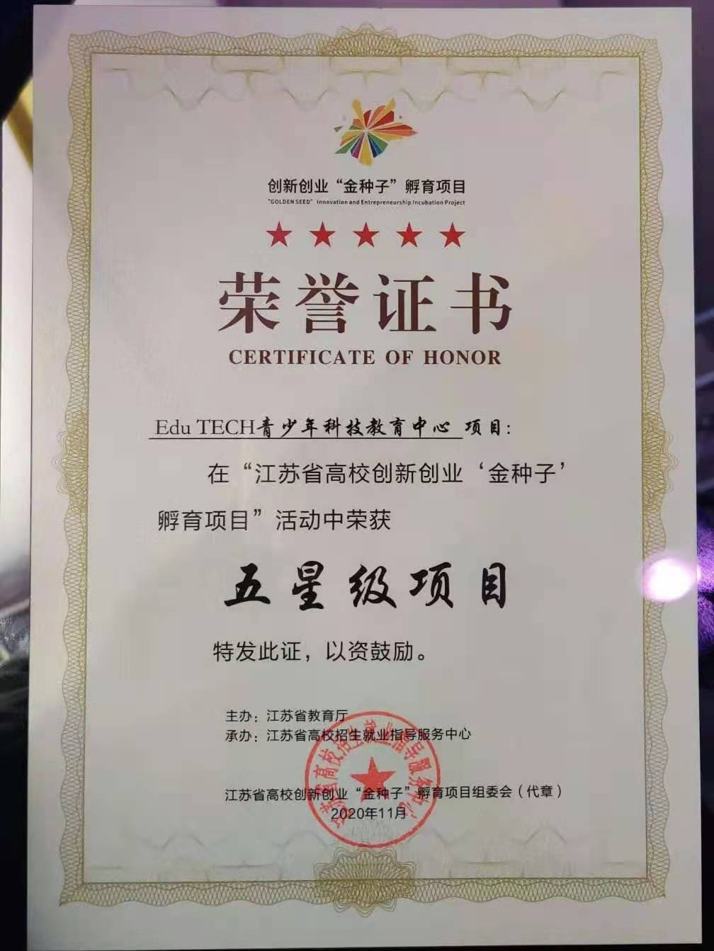 11月28日,由江苏省教育厅主办,省高校招生就业指导服务中心、扬州大学承办的全省高校创新创业“金种子”孵育项目颁奖仪式在常州举行。艺术学院“Edu TECH青少年科技教育中心”创业项目获评五星级项目,并被授予“金种子”称号。