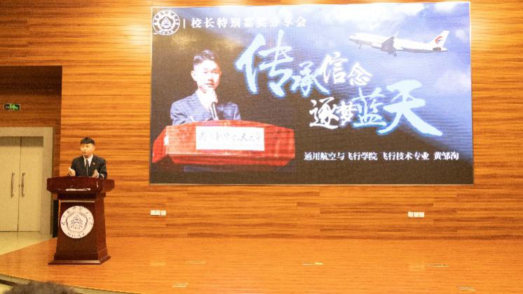 紧接着,会议进入第二篇章:榜样为伍。首先由通用航空与飞行学院18级本科生、校长特别嘉奖获得者黄邹洵讲述了他从大一进校到如今肩负重任、成为集体的领航者的亲生经历,劝勉大家不忘初心、要以身作则。同时指出学生干部也是学生,必须以学习为主,工作为辅。并号召材院各大一新生敢于去想,敢于去做,与专业相结合,脚踏实地,从每一件小事开始,为了自己的目标而努力。