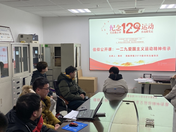 12月22日晚,民航学院举办信仰公开课---一二九爱国主义运动精神传承,本次公开课由2018级本科生辅导员陈欢主讲,学院将军路校区团干、学生代表参加此次信仰公开课。