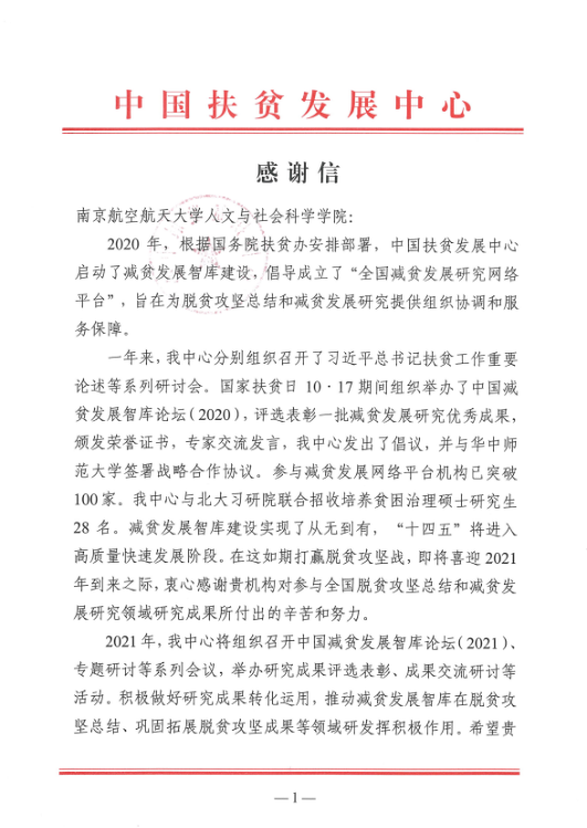 近日,学校人文与社会科学学院收到了国务院扶贫办中国扶贫发展中心发来的感谢信,对学校人文与社会科学学院参与全国脱贫攻坚总结和为减贫发展领域研究成果所付出的辛苦和努力表示感谢。