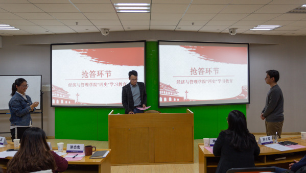 本次比赛增加了学“四史”竞答环节,来自本科第一党支部的赵书平与方俊森同学展开激烈竞争,他们一次次“秒答”赢得同学们阵阵掌声。之后,学院对在“中国大学生在线”平台上四史学习积分前五的优胜小组颁发了荣誉证书。