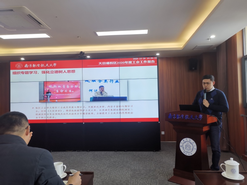 工会主席殷凯做2020年度工会工作报告和财务工作报告。报告从构建学习型工会,做好教职工的“引路人”;构建温暖型工会,做好教工的“娘家人”;构建创新型工会,做好教工的“贴心人”三个方面,回顾了南航天目湖校区工会一年来的工作成果。