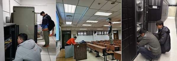 检查保障情况,完善信息服务。为了确保疫情期间线上线下课程同步开展,信息化处对三校区396间在线直播设备进行逐一检修,优化提升了直播传输中的声音质量,拆除了遮挡直播画面的吊扇460个,提升学生的观看体验。同时,为了维护校园网络信息安全、确保新学期教育教学工作顺利开展,信息化处对三校区弱电间以及教室进行了巡检,及时发现问题并妥善处理,为学校各项弱电设施维护、教室信息化设备正常运行提供了安全保障。还完成了高性能计算平台制冷设备配件更换、光盘库设备修理等工作,保障高性能计算平台安全平稳运行。