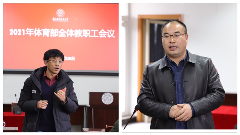 副主任杜长亮汇报了体育教学改革和新学期科研申报部署情况,并介绍在前期充分调研,认真研讨,集思广益的基础上,本学期体育教学在资源库建设、线上线下教学、高年级体测、课外锻炼、留学生锻炼指导、学生体质测评等工作中都做出相应改革。副主任周保辉就体育场地设施安全排查、改造和资产管理等方面的工作做了汇报,激励全体教职工凝心聚力,稳扎稳打,把体育教育的发展融入学校双一流建设大局。