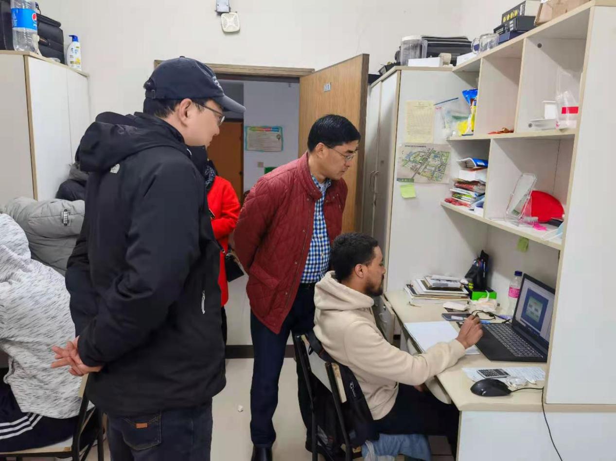 来自埃塞俄比亚的米纳斯同学正在宿舍学习《概率论与数理统计(英文)》课程。当金泉元院长询问他上网课的感受时,学生表示经过一年多的网课学习,已经完全习惯,对于老师的讲解可以反复收听观看,不懂的问题也可以在微信群与老师交流。他说:“这样学习很有效率。”
