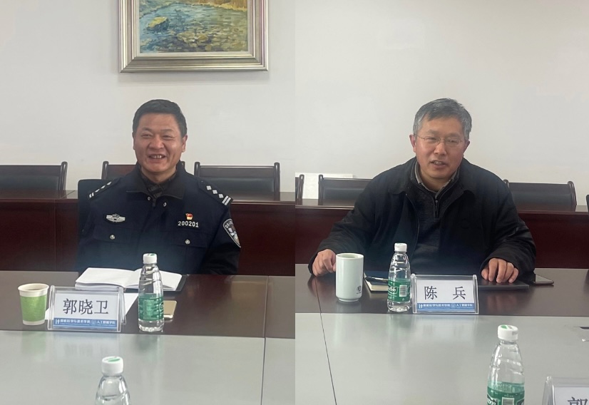 3月3日,南京出入境边防检查站(以下简称南京边检站)政委郭晓卫、政治处主任方夜明等一行6人来我校计算机学院调研交流。计算机学院党委书记刘健荣、院长陈兵,副院长张道强、黄圣君以及相关教师代表参加了此次研讨会,会议由陈兵主持。