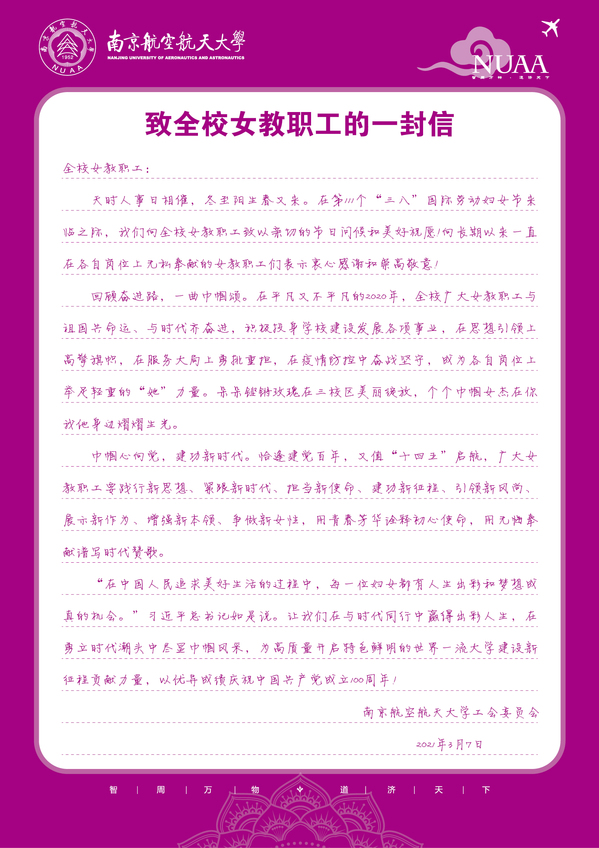“在中国人民追求美好生活的过程中,每一位妇女都有人生出彩和梦想成真的机会。”习近平总书记如是说。让我们在与时代同行中赢得出彩人生,在勇立时代潮头中尽显巾帼风采,为高质量开启特色鲜明的世界一流大学建设新征程贡献力量,以优异成绩庆祝中国共产党成立100周年!