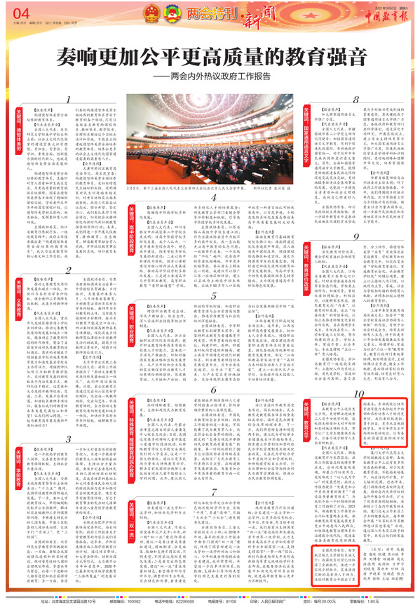 3月6日,《中国教育报》两会专题报道《奏响更加公平更高质量的教育强音——两会内外热议政府工作报告》。