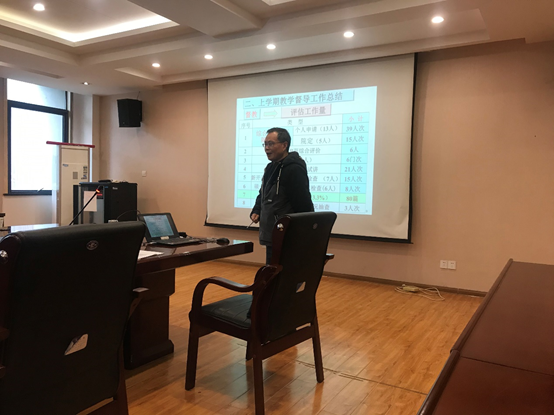 学院督导组组长潘双来代表学院督导组从督导工作的各个方面进行了详细的工作总结和情况交流。潘双来首先汇报了上一学期督导工作安排和检查结果,指出了团队课程建设和教师投入程度的重要性。对抽查结果中存在的问题进行了细致的分析,从学困生指导、重修班模式优化、青年教师成长等方面提出了很多切实有效的建议。