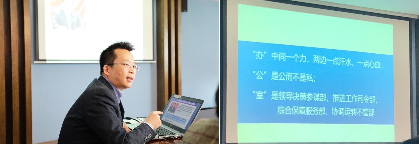 刘宇雷为学院机关同志做了题为《党政办工作的思考与实践》的工作经验交流报告。报告就如何认识办公室工作、如何理解办公室工作、如何做好办公室工作三大方面进行了深入细致地阐述。报告中特别学习了习近平总书记对办公室工作的五个坚持的重要指示;并对办公室的工作职能、工作定位、工作理念,工作原则、工作要求,提出了高标准的专业要求;他还从如何做好理论与实践的统一、如何做好“人”和“事” 的统一、如何做好追求卓越与底线思维的统一、如何做好严谨细致与高标专业的统一等四个方面,深入浅出,和大家分享了做好办公室工作的宝贵经验和体会,党政办工作人员要有更高的站位,做更好的参谋,更深入的落实,切实推进机关工作。