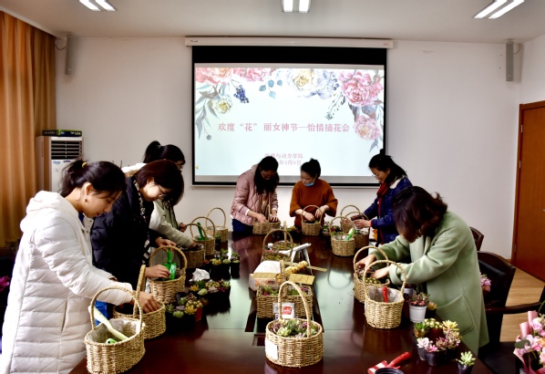 本次活动分为两个部分。学院工会组织的插花、种植“多肉”小盆栽活动环节,花艺老师结合当日准备的花材为大家讲授了花艺、养护的基本知识,在专业指导下,女老师们纷纷动手设计自己的花艺作品,挑选花材,搭配花束和多肉盆栽。活动中,30余个特色各异的花篮、精彩纷呈的花束在老师们的巧手中诞生。