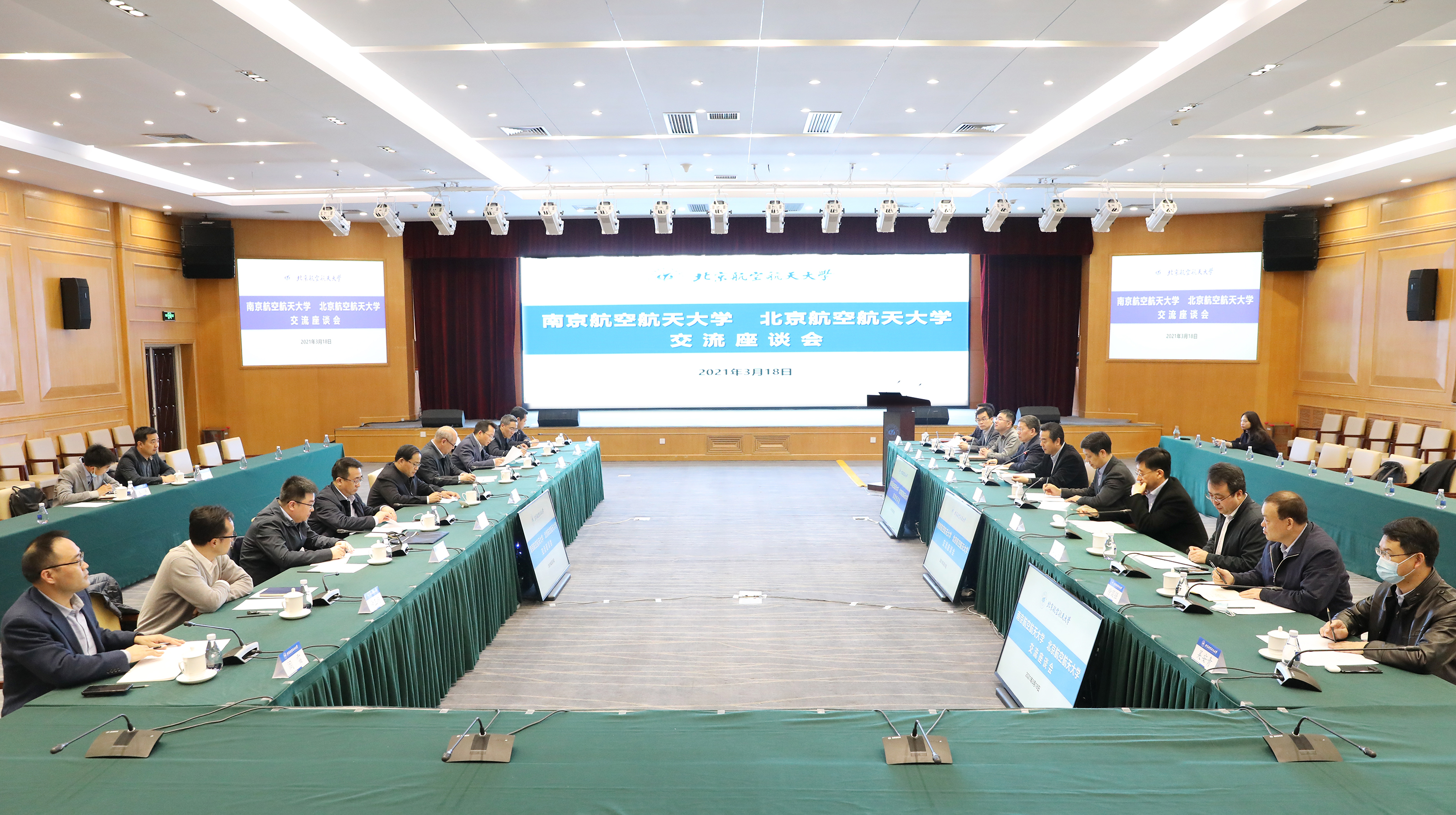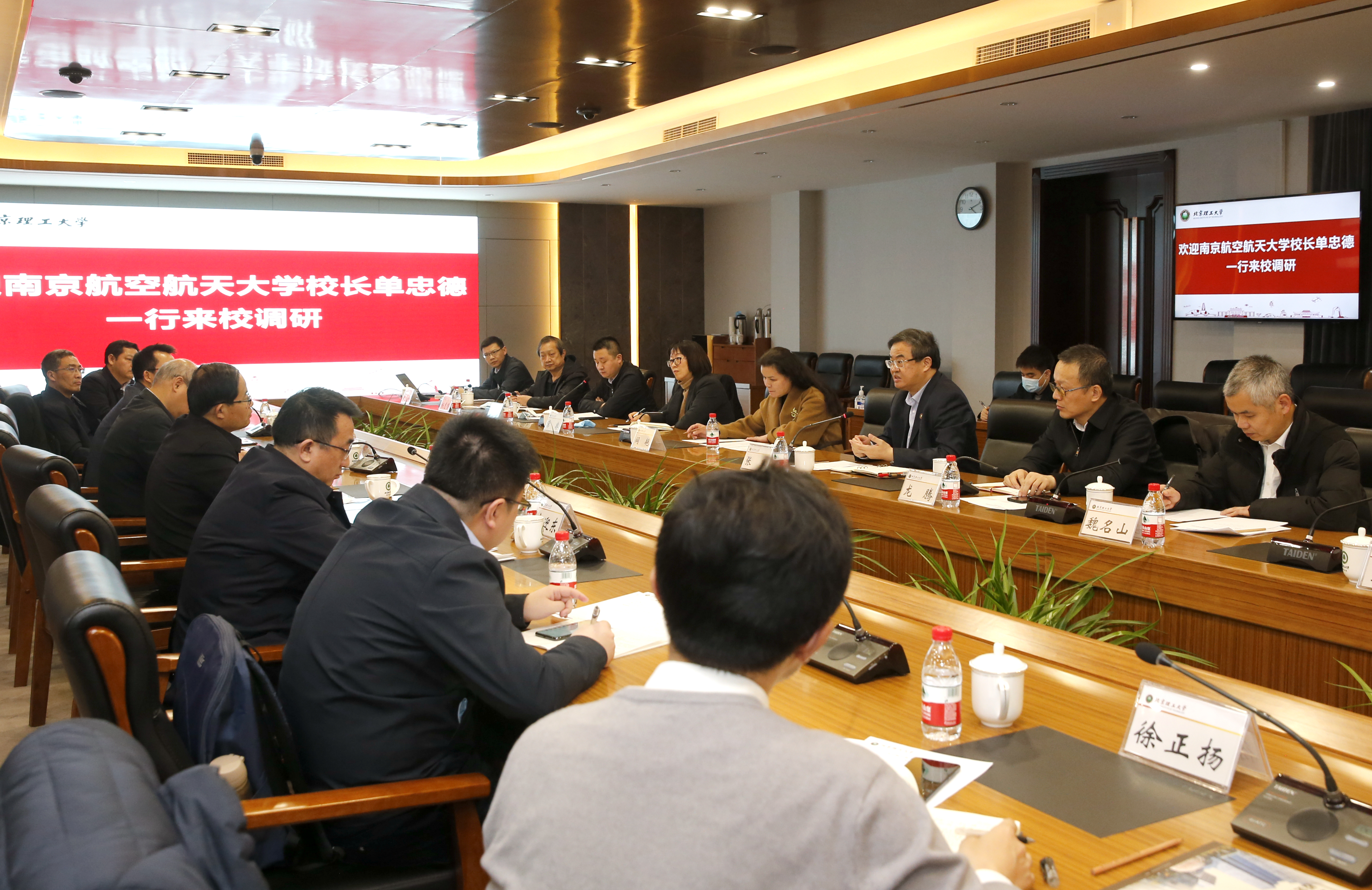 徐惠彬指出,北航与南航同根同源,合作源远流长,在人才培养、项目申报、学术交流等方面建立了紧密联系,取得了显著成效。他介绍了近年来北航在职称评审、研究生毕业成果评价、专职科研队伍建设、校地研究院运行管理等方面的改革经验与创新做法,并期待双方继续深化合作,力争产出更多合作成果。单忠德表示,南航始终坚持有特色、高水平、高质量内涵式发展,与北航拥有共同的红色基因、强国使命与发展愿景,期待双方能共同瞄准“四个面向”,聚焦“两个强国”建设需求,在服务国家重大工程上进一步密切战略合作,促进交流更深合作更实,力争取得更多重大基础前沿和关键核心技术突破,为国家航空航天事业、“两个强国”建设提供更坚实的服务支撑。