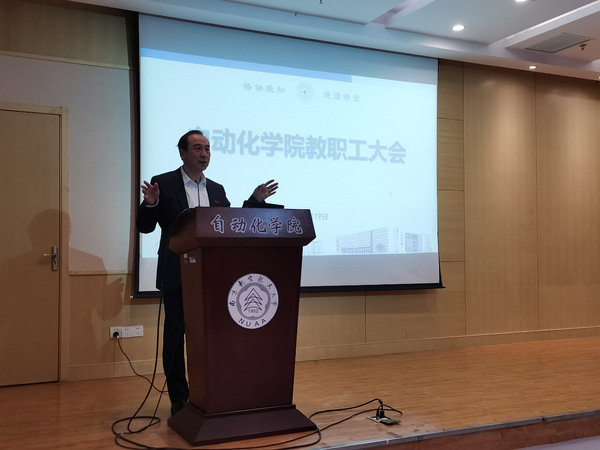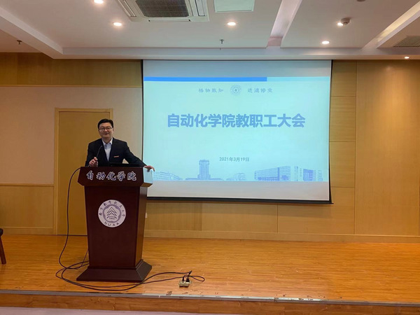 2021年3月20日,自动化学院召开了新学期全院教职工大会。党委书记李文雷同志传达了学校2021年干部教师大会暨全面从严治党工作会议精神,对“安全、稳定、保密”三确保工作进行了通报;院长江驹同志对学院2020年下半年工作进行了总结并对2021年上半年工作做了部署。学院全体教职工参加了会议,会议由党委书记李文雷同志主持。