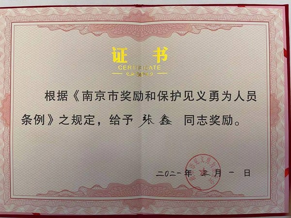 2021年3月19日南京市见义勇为基金会对我校体育部教师张鑫于2020年11月救助我校一名本科大四女生,进行表彰与奖励。