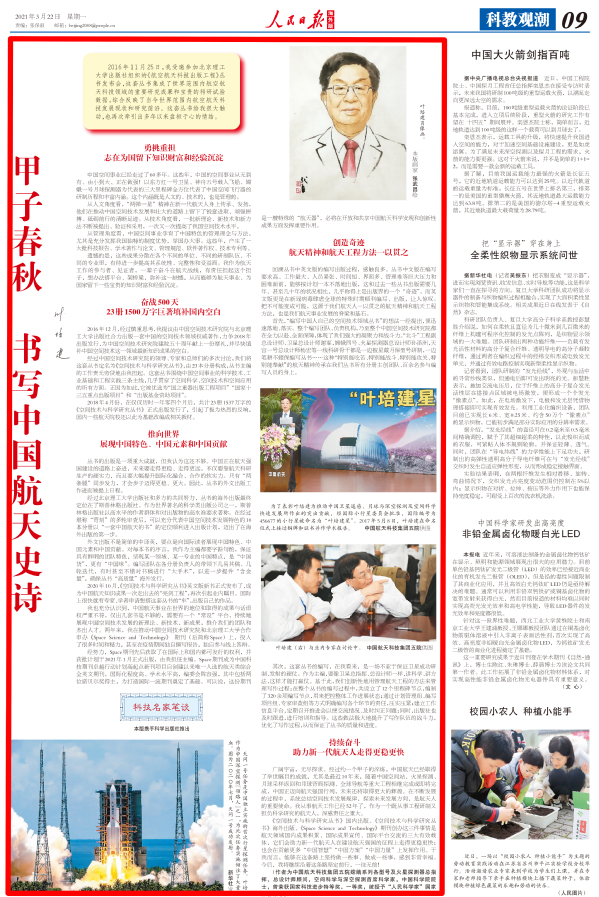 3月22日《人民日报》海外版《科教观潮》栏目刊发“人民科学家”、中国空间技术研究院研究员、我校航天学院院长叶培建院士所撰写的文章。叶培建在文章中回顾了他担任《航空航天科技出版工程》丛书主编期间,带领团队编写丛书中英文版及创办英文期刊的心路历程。