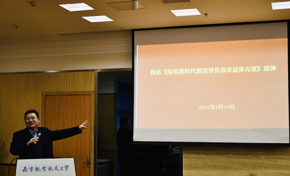 吴启晖结合3月9日我校《深化新时代教育评价改革》专题报告会上教育部综合改革司体制改革处处长李轶群对《深化新时代教育评价改革总体方案》的解读,带领全院教职工深入学习领会《总体方案》精神。