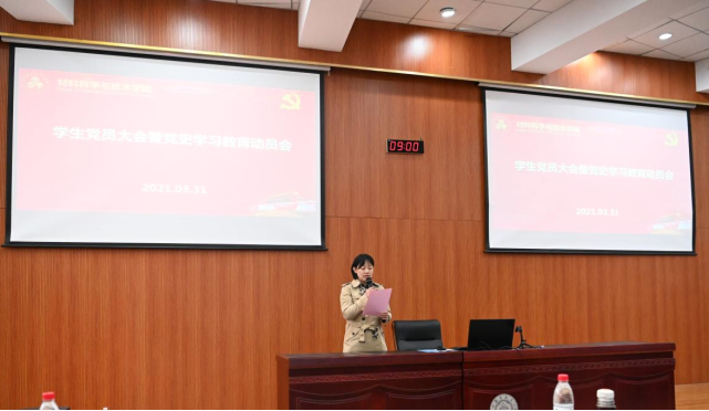 草色青青柳色黄,桃花历乱李花香。2021年3月的最后一天,材料科学与技术学院在2号楼2111教室召开了学生党员大会暨党史学习教育动员大会,南京航空航天大学学生处副处长张亚丽,校团委副书记董羽,马克思主义学院副院长、教授何畏,材料科学与技术学院党委书记石勇,党委副书记许赞,党政办公室主任彭恬,团委书记徐萍,各年级辅导员以及材料科学与技术学院全体学生党员们参加了此次大会,会议由许赞主持。