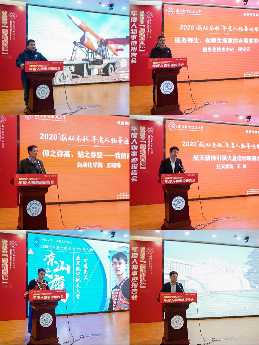 2020“感动南航”年度人物、CK长空靶机供靶团队代表张元杰讲述了团队在戈壁沙漠铸就“国之重器”的故事;信息化技术中心系统资源部主任何安元讲述了自己深耕校园信息化建设十八年的成长和蜕变;自动化学院教授、副院长王晓琳讲述了自己“24小时开机,有问题随时联系我”的师者承诺;航天学院副教授、副院长王寅讲述了率领团队研制我国首个火星探测器的故事;经济与管理学院学生阿恩克其讲述了自己创建支教团队,助力家乡扶贫的故事;保卫处治安管理科科长周栋栋讲述了自己在疫情期间从手术台上“逆行而上”,勇担疫情防控职责的故事。