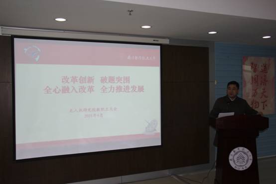 4月2日,无人机研究院召开全院教职工大会,传达学校干部教师大会暨全面从严治党工作大会精神,部署研究院2021年度工作。院党政领导班子成员、科室主任、党支部书记和全体教职工参加会议,院党委书记高小泽主持会议。