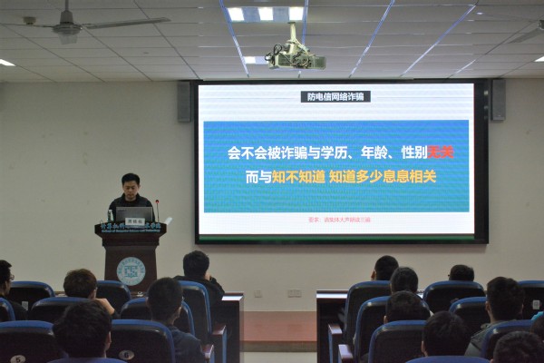 周栋栋结合我校真实的电信诈骗案例,向大家介绍了常见的诈骗类型、形式与手法,并通过微课、录音、宣传短片等方式展现真实的诈骗过程,还与现场同学进行情景模拟还原诈骗情景。生动有趣的讲授方式吸引了在场学生的兴趣,帮助学生更加直观地认识到诈骗案件的过程细节,增强学生安全意识,学会用法律武器保护自己的合法权益,为在场师生上了一堂生动详实的安全教育讲座。