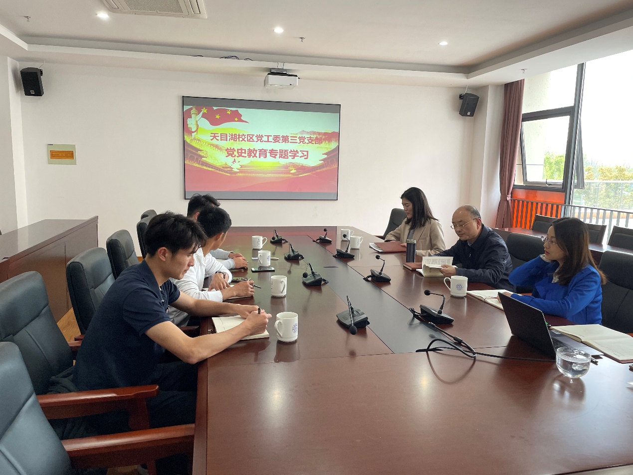 根据校党委《关于组织开展2021年在线学习的通知》的相关要求,4月14日下午,天目湖校区党工委第三党支部在综合服务楼204会议室开展党史教育集中学习会,学习“知史爱史——跟习近平总书记学党史”相关主题内容。本次学习会议由第三党支部书记王霏主持,支部全体党员参与学习。