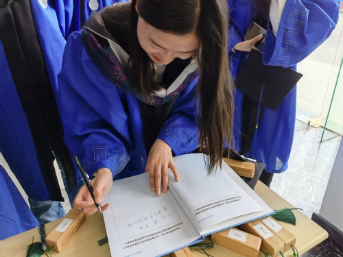 建言献策本记录毕业前最想说的话。在学院拍摄毕业合影前,学院组织全体研究毕业生到大厅参加学校纪念章领取仪式,留下一份南航独家记忆,同时邀请每位同学在建言献策本上写下了自己对学院的祝福与建议。留言的过程让毕业生感受到了从学生到校友角色的转换,同学们纷纷表示,虽然马上要毕业离开学院,但是可以为学院提出自己建议,留下自己的期待,感觉非常温暖。