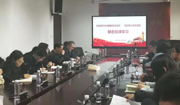 4月14日,马院博士生党支部与校纪监审机关党委联合党支部以线上线下相结合的方式进行党史学习教育专题联合党课学习。会议由纪监审机关党委联合党支部书记雷江发主持,马克思主义学院三位博士生党员为全体人员上了专题党课,纪监审机关党委支部党员代表做了重点发言。