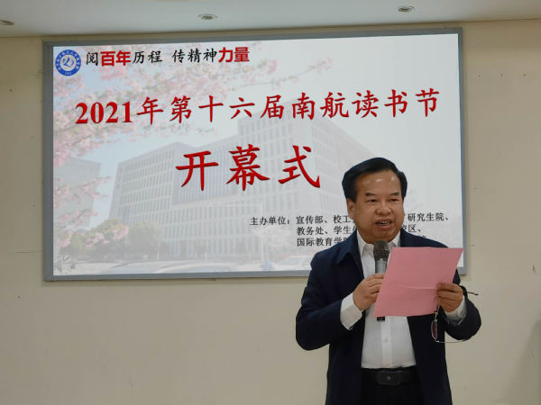 在第26个“世界读书日”到来之际,4月22日上午,“阅百年历程 传精神力量”2021年第十六届南航读书节在明故宫校区图书馆一楼读者活动中心开幕。开幕式由图书馆馆长王成华主持,副校长姜斌,南京市档案馆副馆长张军、宣传教育处处长王伟出席开幕式,宣传部、校工会、校团委、研究生院、学生处、教务处、档案馆、天目湖校区管委会、国教院、图书馆等部门的领导、图书馆全体党员和师生代表参加了开幕式。