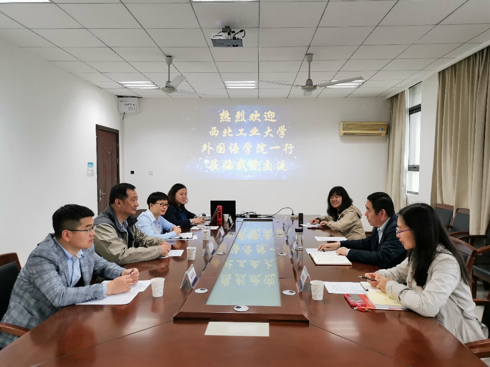 4月23日,西北工业大学外国语学院副院长张奕等一行四人来我校外国语学院调研。外院院长范祥涛,副院长徐以中,研外系主任陆红及英语系副主任信慧敏参加了此次交流活动。