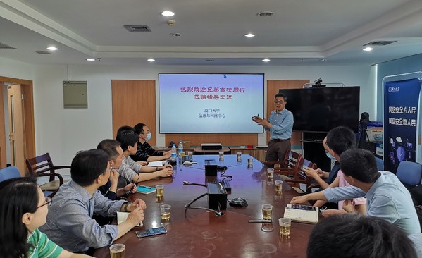 调研组一行与厦门大学信息与网络中心主任肖德洪及相关科室负责人等进行了座谈。肖德洪从部门完成的任务与职责、智慧校园建设、数据治理、近两年来重点工作情况等方面介绍了厦门大学网信工作情况。调研组现场观看了厦门大学智慧门户平台,了解和学习了厦门大学信息化建设的一些先进经验。双方就高性能计算平台建设与运维、部门职责、项目资金管理、日常故障维护等问题进行了深入探讨和交流。