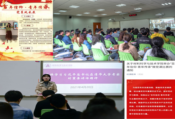 为了贯彻上级组织开展党史学习教育的工作部署,聚焦思想引领主责主业,引领全院团员青年“学党史、强信念、跟党走”,做到学史明理、学史增信、学史崇德、学史力行。材料科学与技术学院结合学院实际,积极探索行之有效的党史学习教育途径。推出“百年信仰 风采传承”百名优秀学生党员风采展,学习先进,砥砺自我;及时开展“习总书记清华大学考察时的重要讲话”交流会,激励学生肩负使命,坚定信心;除此之外,学院还将在5月份开展党史故事支部接力学、“百年信仰 青年传承”微党课比赛鼓励学生从百年党史中产生的优良传统、红色基因中汲取思想道德营养,从百年党史中涌现出来的优秀共产党人的感人故事中获取信仰力量。